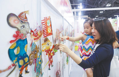 家长与孩子在首届中国(北京)动画周上观看展出的皮影。